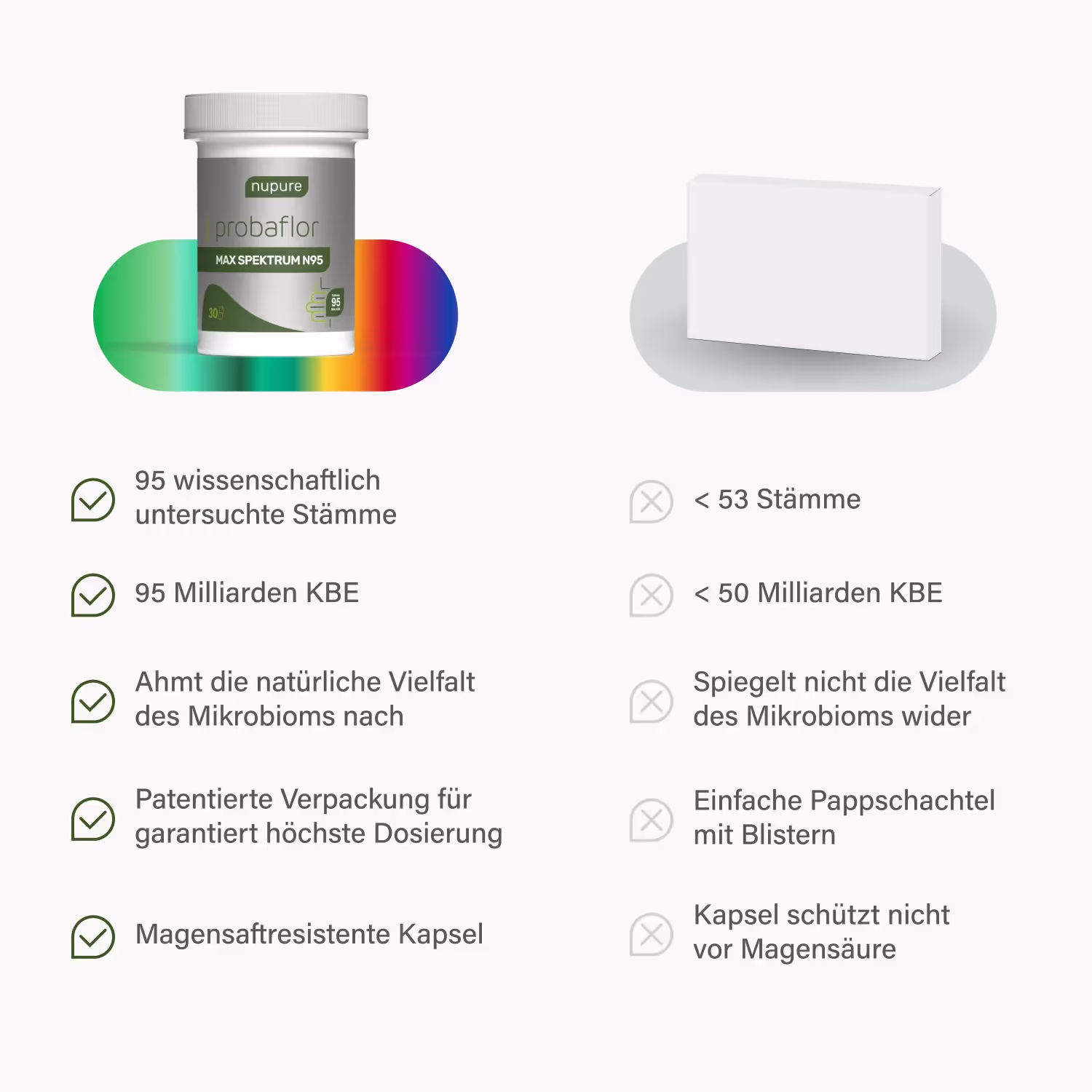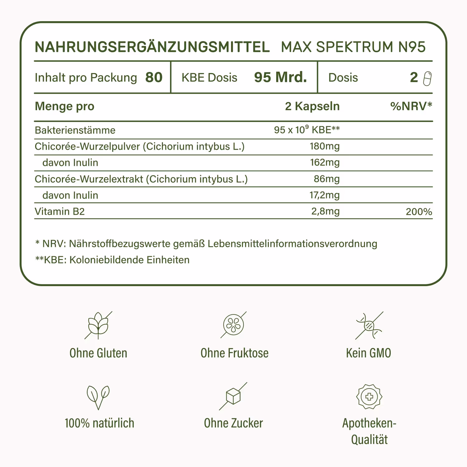 Damit die Bakterien eine hohe Überlebensrate haben, müssen sie sorgfältig konserviert und gelagert werden. Deshalb verwenden wir für MAX SPEKTRUM N95 spezielle Activ-Vial™-Dosen. Diese sind mit einem aktiven Polymer ausgekleidet und absorbieren effektiv Feuchtigkeit. MAX SPEKTRUM N95 hat eine garantierte Ultra-Hochpotenz von 95 Milliarden KBE pro Tagesdosis bis zum Ende der Haltbarkeitsdauer.
