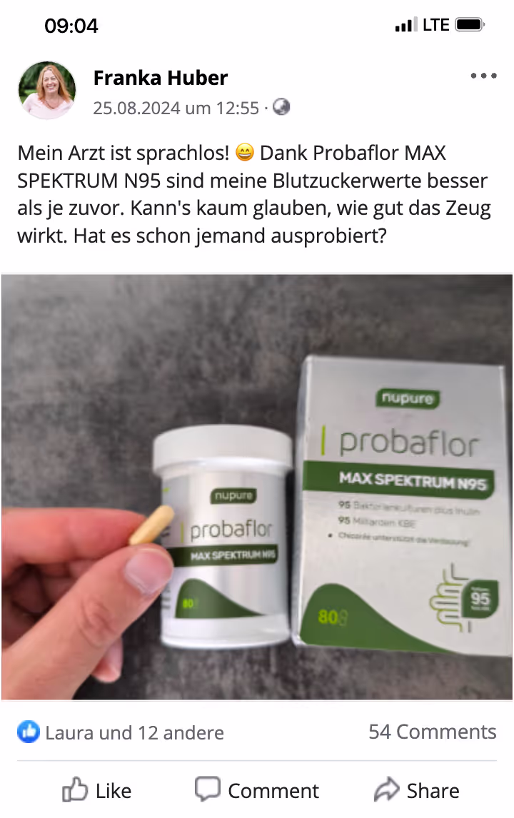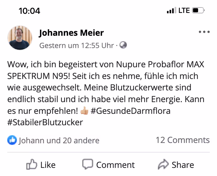 Schon nach wenigen Wochen habe ich eine deutliche Verbesserung meiner Blutzuckerwerte festgestellt. Meine Heißhungerattacken sind fast verschwunden und ich fühle mich insgesamt vitaler. Mein HbA1c-Wert ist zum ersten Mal seit Jahren im Normalbereich. Bin gespannt auf die langfristigen Effekte von Probaflor MAX SPEKTRUM N95.