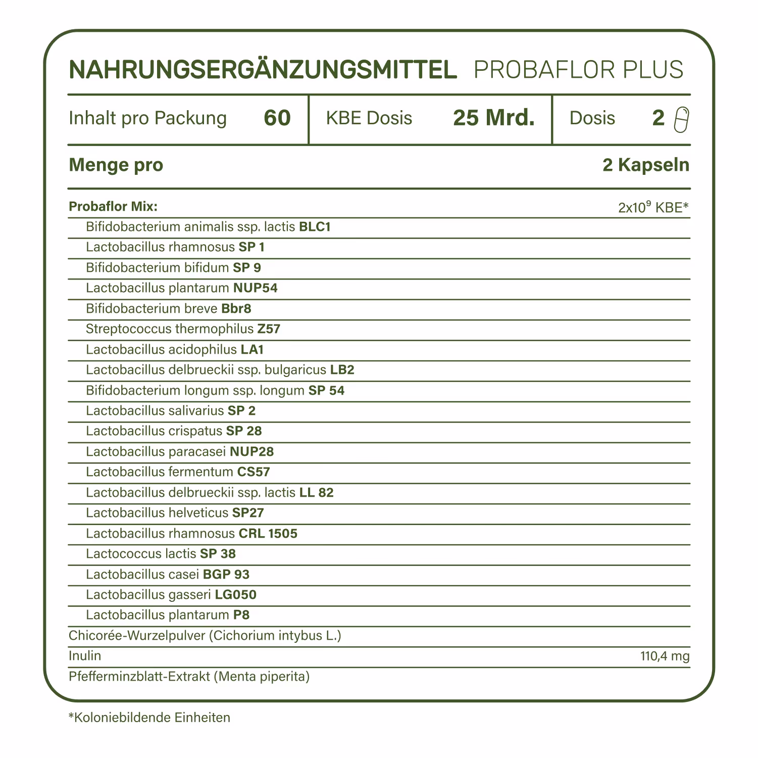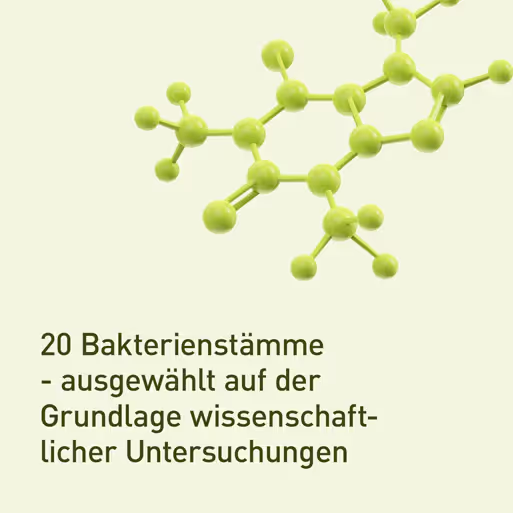 - 20 sorgfältig ausgewählte Bakterienstämme (u.a. Lactobacillus und Bifidobacterium)