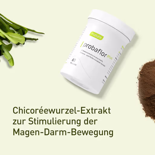 Nupure probaflor ist ein Präparat mit Bakterienkulturen. Diese gehören zu den natürlichen Besiedlern des Darms, wo sie verschiedene wichtige Aufgaben erfüllen. Zusätzlich enthält nupure probaflor plus Chicoréewurzelplver und Pfefferminzextrakt zur Unterstützung der Verdauung.